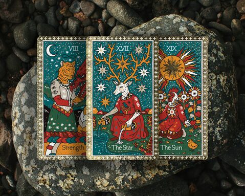 The Arcane Wildlife Tarot is a beautifully illustrated deck that stays close to traditional tarot. The Major Arcana keeps its weight and direction-changing force, though human figures are replaced with carefully chosen animals whose behaviour does the symbolic work. Jack jokes that when a Major appears, you can “forget your tea”. Something larger is underway. The compositions nod to familiar tarot imagery, but the visual language is distinctly his.