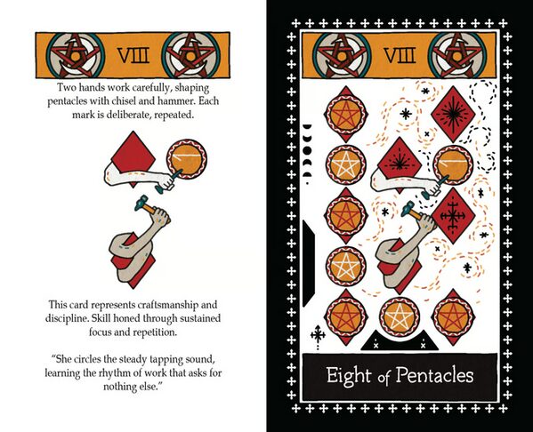 The Minor Arcana is where his background as an award-winning playing card designer really shows. This is a pip deck, but not a sterile one. “Playing cards and tarot are cousins who pretend not to know each other,” he says. “I wanted to reunite them.” Each number card becomes a small scene caught mid-movement. Objects lean, gather, drift. Nothing announces its meaning. The story is happening whether you narrate it or not. For readers used to heavily illustrated minors, this restraint feels deliberate rather than sparse.