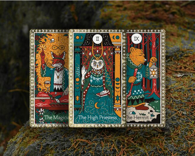 For Arcane Wildlife, he wanted both sets of cards to feel useful in multiple ways: sturdy for games, expressive for readings, and rich enough to reward close attention.
